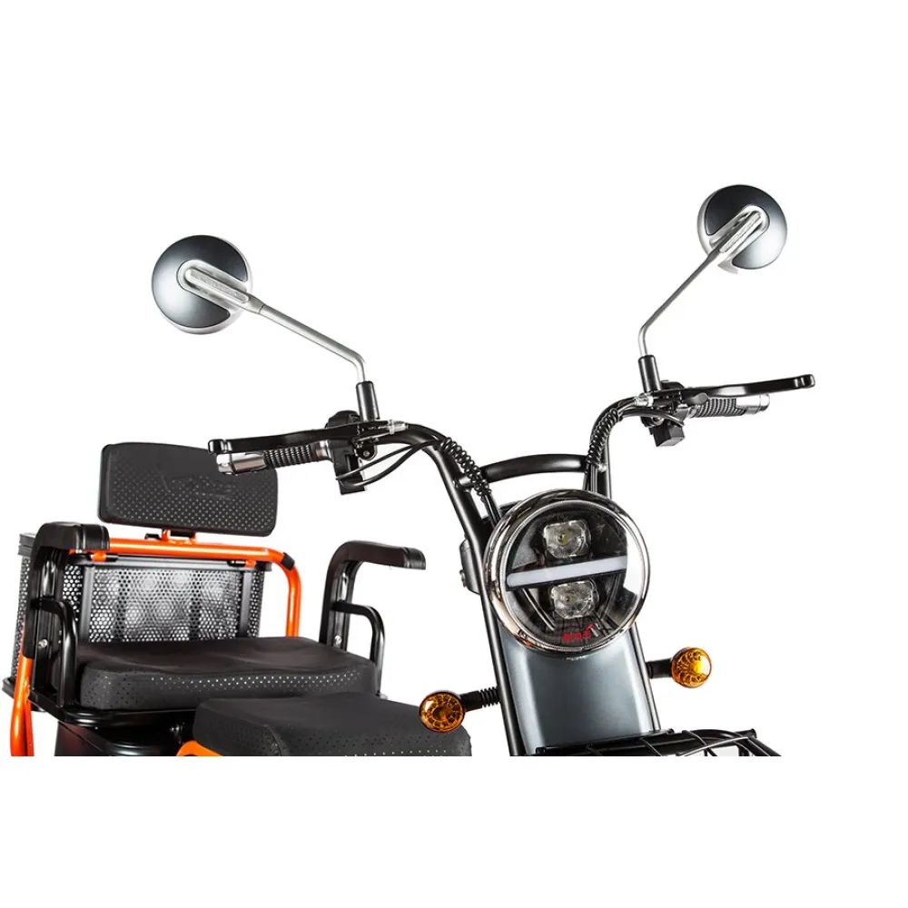Повышенная устойчивость объясняется широкими колесами с протекторным рисунком для лучшего прохождения тс по неровной дороге. Модель обработана специальным сверхпрочным покрытием, надежно защищает от повреждения металла коррозией и различных деформаций. Максимальное прохождение расстояния на одном заряде обеспечивается долговечным аккумулятором электротрицикла. Приятной неожиданностью пользователю станет наличие охранной сигнализации с фирменными брелоками для защиты от угона.