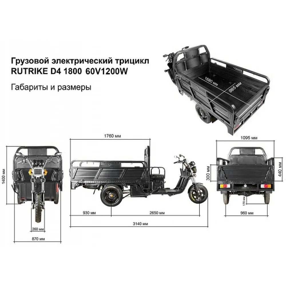 Грузовой электротрицикл Rutrike D4 1800 60V1200W черный – выглядит мощно и серьезно. Впечатляет дизайном. Модель рассчитана на предприимчивых личностей, занимающихся коммерцией или имеющих огороднический участок. Приобрести тс по цене производителя в оперативном режиме позволит сотрудничество с нашим интернет-магазином. Стальная конструкция электротрицикла прочная и надежная, выдерживает максимальную грузоподъемность до 1 тонны или вес 10 взрослых человек.